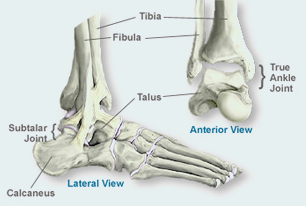The true ankle joint is composed of 3 bones, seen above from a front, or anterior, view: the tibia which forms the inside, or medial, portion of the ankle; the fibula which forms the lateral, or outside portion of the ankle; and the talus underneath. The true ankle joint is responsible for up & down motion of the foot.