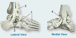 The ends of the bones in these joints are covered by articular cartilage (1). The major ligaments of the ankle are: the anterior tibiofibular ligament (2), which connects the tibia to the fibula; the lateral collateral ligaments (3), which attach the fibula to the calcaneus and gives the ankle lateral stability; and, on the medial side of the ankle, the deltoid ligaments (4), which connect the tibia to the talus and calcaneus and provide medial stability.