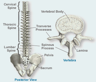 The normal anatomy of the spine is usually described by dividing up the spine into 3 major sections: the cervical, the thoracic, and the lumbar spine. (Below the lumbar spine is a bone called the sacrum, which is part of the pelvis). Each section is made up of individual bones called vertebrae. There are 7 cervical vertebrae, 12 thoracic vertebrae, and 5 lumbar vertebrae.